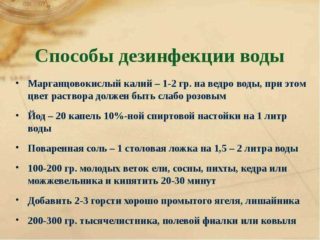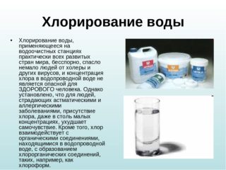 L'utilisation de désinfectants pour l'eau vous permet de vous débarrasser des micro-organismes nocifs. La plupart des méthodes sont utilisées pour le traitement des effluents domestiques et industriels. Il existe des méthodes modernes de désinfection qui permettent d'utiliser de l'eau préparée pour les besoins des ménages à partir d'un approvisionnement en eau centralisé.