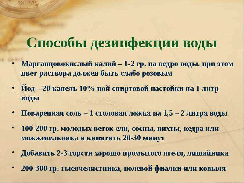 Avant d'utiliser une méthode de désinfection spécifique, la qualité d'origine de l'eau est prise en compte. Les caractéristiques du liquide à obtenir de la purification sont prises en compte. Ces exigences sont précisées dans la documentation réglementaire relative à l'eau potable ou aux besoins ménagers des piscines.