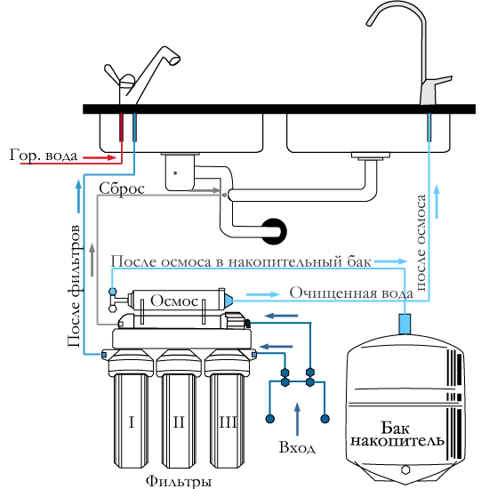 L'élément principal du système est une membrane poreuse à travers laquelle le fluide s'écoule sous pression. Dans une maison privée avec une bonne pompe, c'est plus facile à faire que dans un immeuble de grande hauteur aux étages supérieurs, où la pression est si basse qu'il faudra installer une autre pompe dans l'appartement.