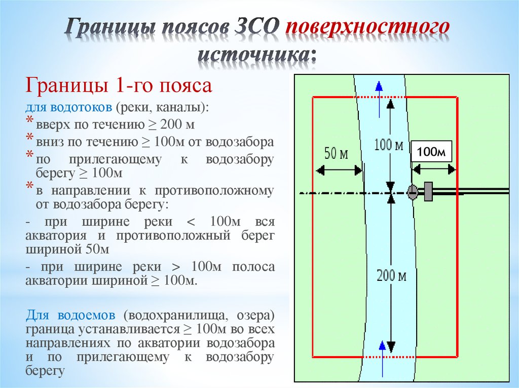 - La deuxième ceinture impose des restrictions sur le territoire adjacent à la première, toute construction y est interdite. La limite de la ceinture est déterminée individuellement, en fonction de la taille du territoire et de la source, de la vitesse de déplacement de l'eau, qui sont nécessaires à l'auto-épuration du plan d'eau.