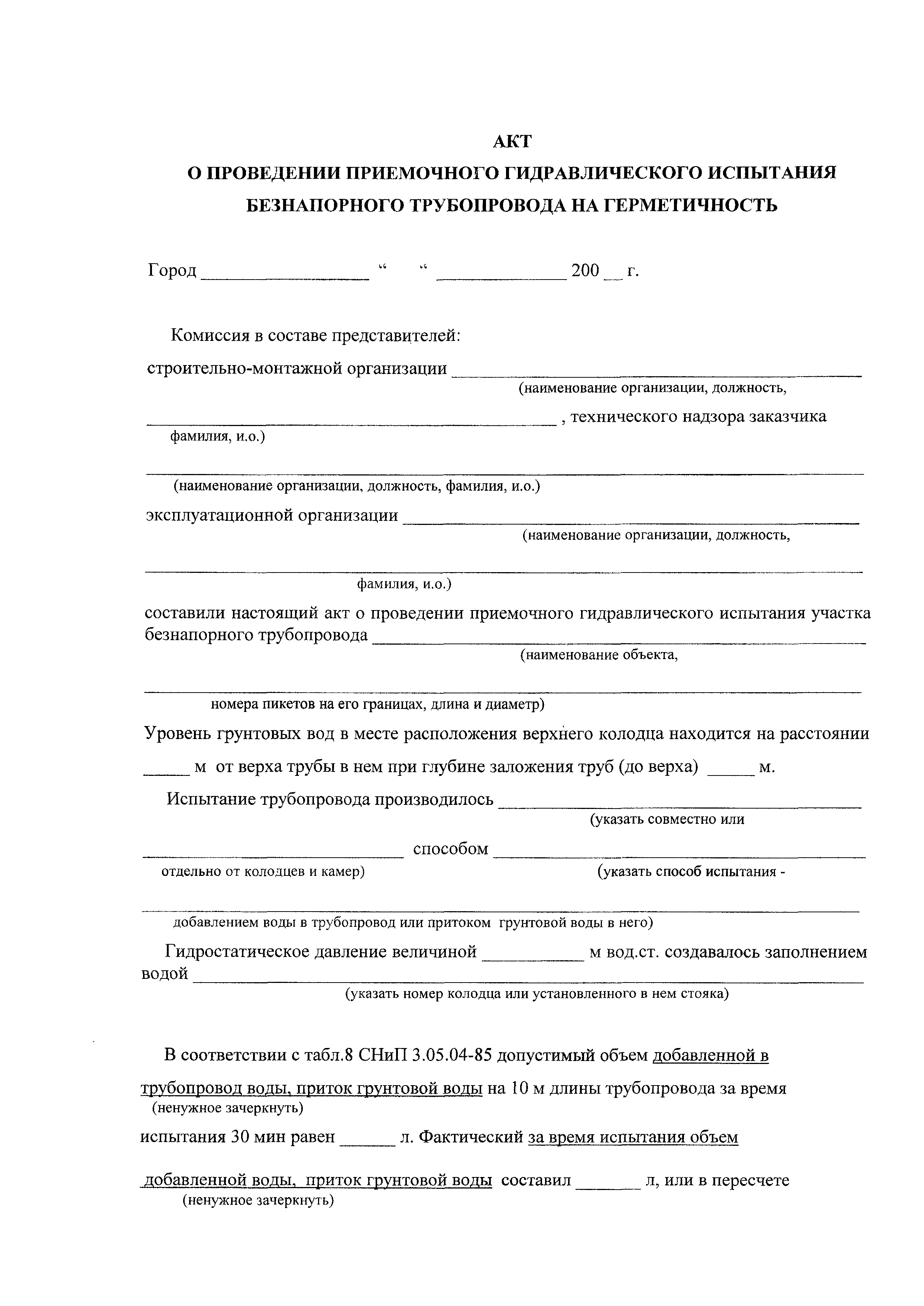 Les données obtenues à la suite d'essais hydrauliques sont entrées de la manière la plus détaillée dans l'acte de réception du système d'approvisionnement en eau. Cela inclut également des informations sur les modifications et les réparations effectuées pendant les tests. L'acte de test d'approvisionnement en eau est la preuve de la qualité et de l'excellent état du système d'approvisionnement en eau, de sa disponibilité opérationnelle.