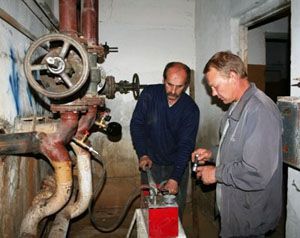- Les robinets d'arrivée sont fermés et, à l'aide d'une pompe à pression, l'eau est lentement évacuée des tuyaux.