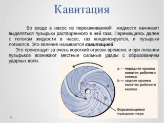 La cavitation est une violation de la densité de la colonne d'eau, en d'autres termes, le remplissage du pipeline avec des bulles d'air. Formé dans des zones à pression réduite au point critique. Le phénomène s'accompagne de la formation d'un vide dans le pipeline, des formations de bulles formées à la suite de l'interaction des gaz et des vapeurs libérés par l'eau de puits.