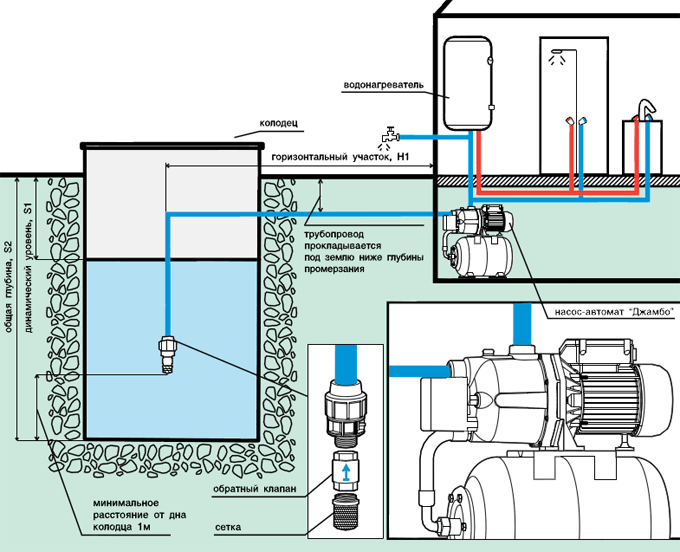 Si le puits est très profond, l'eau devra être pompée avec une unité de profondeur. Schéma d'installation de la station :