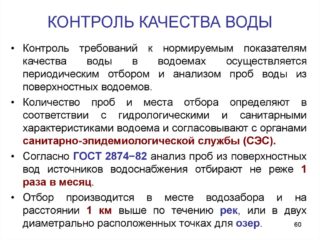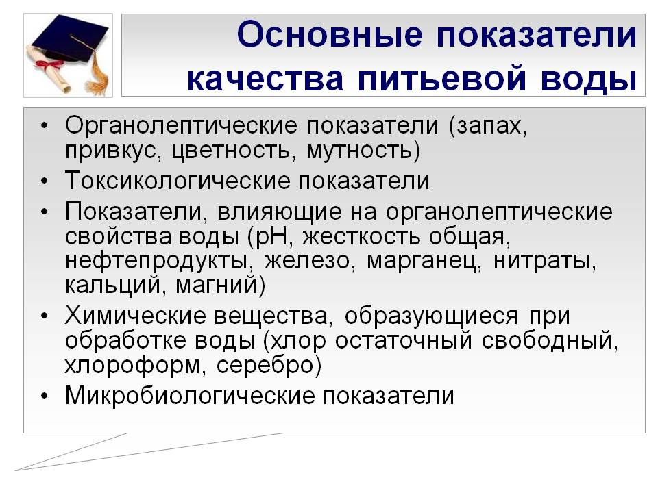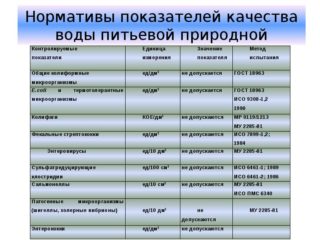 Dans les indicateurs standard, il existe des critères qui déterminent la quantité de métaux lourds, d'éléments de dureté, de nitrates, de produits pétroliers, d'arsenic, de cyanures et d'autres éléments pour un certain volume de liquide. Le pH de l'eau potable est également indiqué.