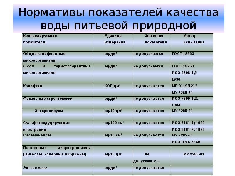 L'eau peut contenir des bactéries dangereuses telles que E. coli et Pseudomonas aeruginosa, Staphylococcus aureus, d'autres types de micro-organismes colymorphes qui vivent dans l'intestin inférieur des animaux domestiques ou des humains. Selon les documents réglementant la qualité de l'eau, ils ne devraient pas être dans le liquide de consommation.