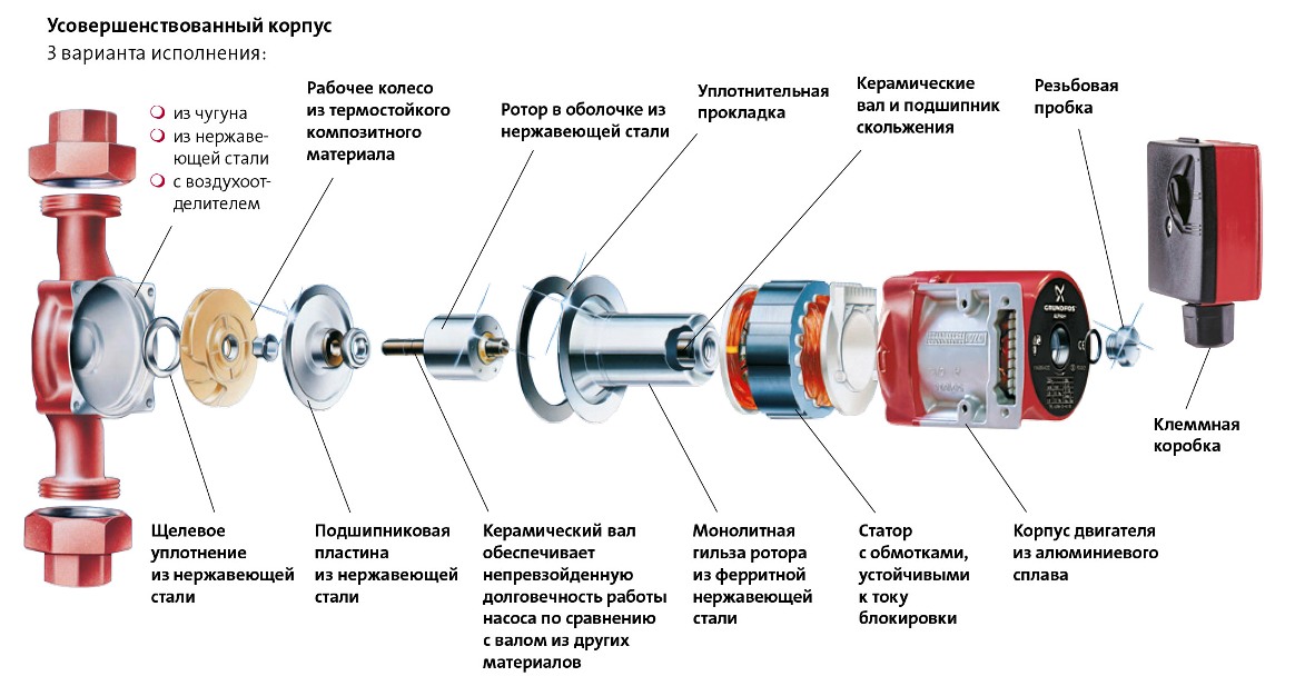 Les pompes de surpression sont des conceptions robustes avec un moteur électrique monobloc. Étant donné que les pièces de l'unité d'alimentation sont en contact permanent avec le milieu aqueux, des matériaux résistants à l'usure et ne craignant pas la rouille sont utilisés pour la production : fonte, bronze, laiton, "acier inoxydable". La partie active de la pompe n'est ouverte que d'un côté. La cloche d'aspiration frontale est située au-dessus de l'arbre de l'appareil et un élément de cloche d'alimentation est installé au-dessus.