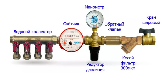 Pour plus de commodité, choisissez une section horizontale. Tout d'abord, fermez l'alimentation en eau, puis installez une vanne à l'entrée, le filtre, le réducteur et le robinet à tournant sphérique. Pour éviter les fuites, toutes les connexions sont scellées avec du câble.