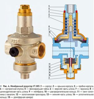Le réducteur, dans lequel la vanne est réalisée sous la forme d'un diaphragme, est un dispositif fiable. Il ne nécessite pas de configuration manuelle. Le débit du régulateur à membrane peut atteindre 3 m3 / h. La vanne divise la chambre en 2 parties.Un ressort est situé dans le compartiment scellé derrière lui, qui, après avoir reçu une impulsion du pétale élastique, est comprimé, mettant en mouvement une valve qui ferme le trou. Cela réduit le débit d'eau et la pression dans le système diminue.
