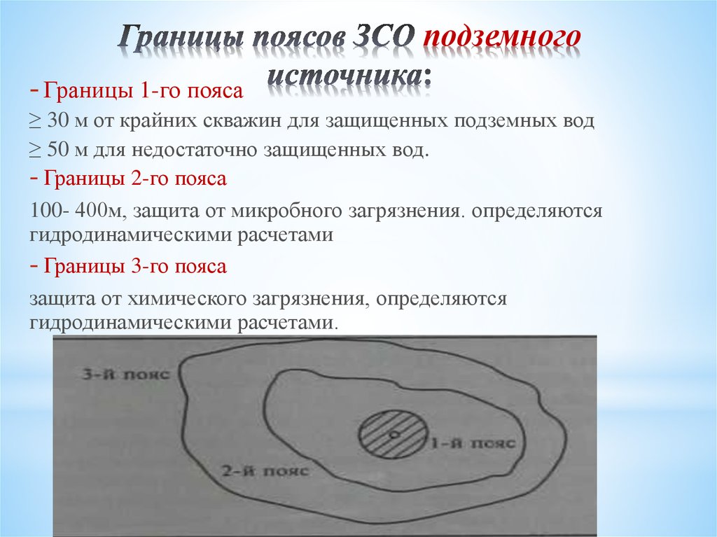 La taille de la zone est déterminée individuellement pour chaque type d'aquifère. Le calcul du diamètre de la zone sanitaire est effectué en tenant compte de l'intervalle de temps nécessaire à la pénétration des polluants bactériens et chimiques dans le point de prise d'eau.