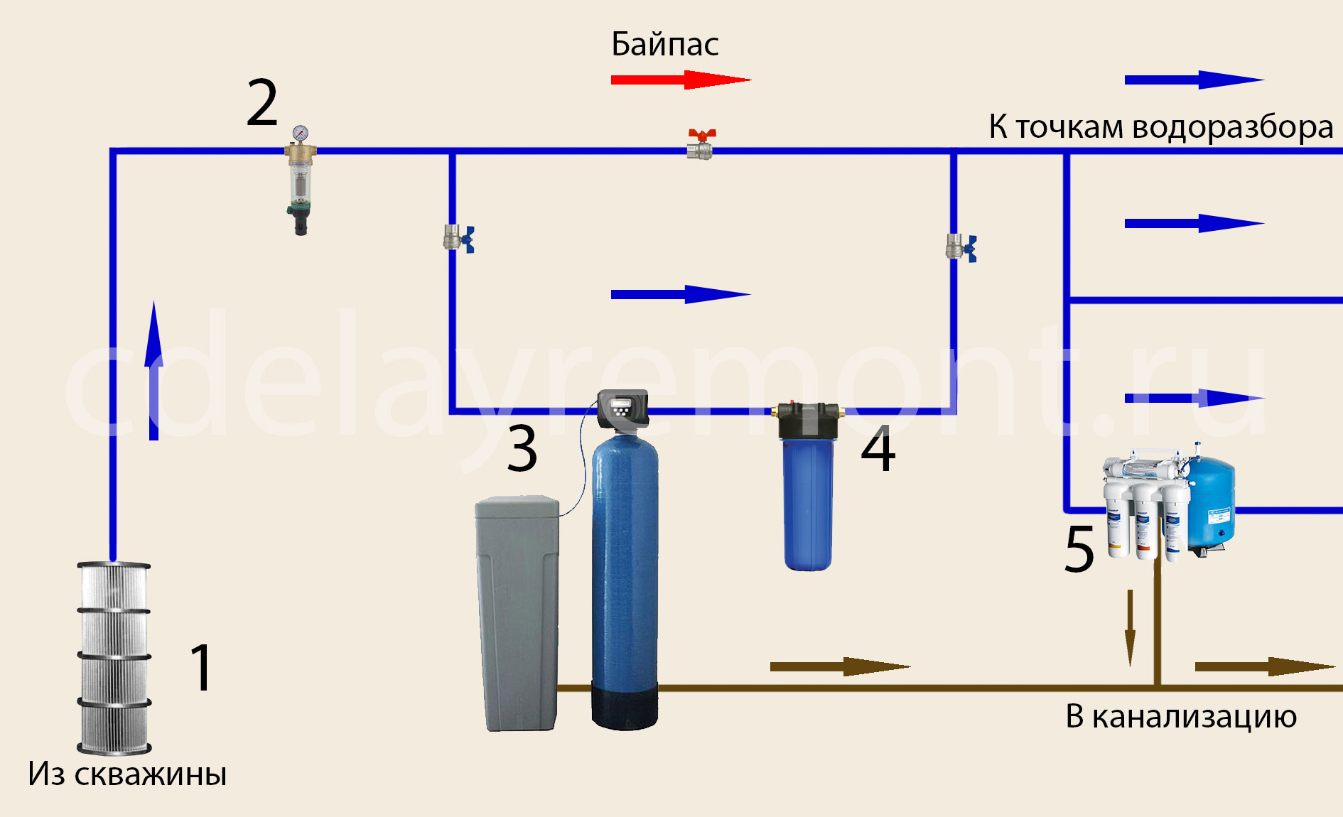 Ceci est facultatif, mais le schéma préféré. Le nombre total de nœuds est déterminé en fonction des qualités individuelles de l'eau. Il est obligatoire d'installer uniquement un filtre grossier.