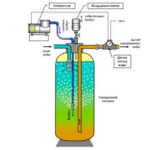 - Chimique. Les suspensions de fer, de calcium, de manganèse et d'hydrogène sulfuré sont éliminées, un adoucissement de l'eau est effectué. Pour cela, des colonnes d'aération et de déferrisation sont utilisées.