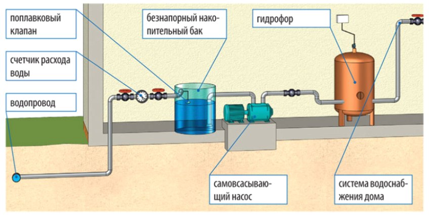 Pour que la banlieue soit constamment approvisionnée en eau pour les besoins domestiques et économiques, il est conseillé d'installer immédiatement le système d'alimentation en eau d'une maison privée avec un réservoir de stockage et une pompe. Une telle autoroute permettra aux propriétaires du chalet d'utiliser les commodités sans apporter les services publics au village.