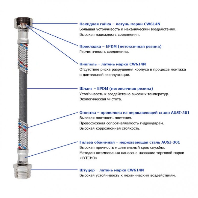 - Renforcé. L'intérieur du conduit d'eau est en caoutchouc élastique. Pour le protéger des virages serrés, des cassures, il est placé dans une tresse métallique spéciale. C'est le type de produit le plus demandé.