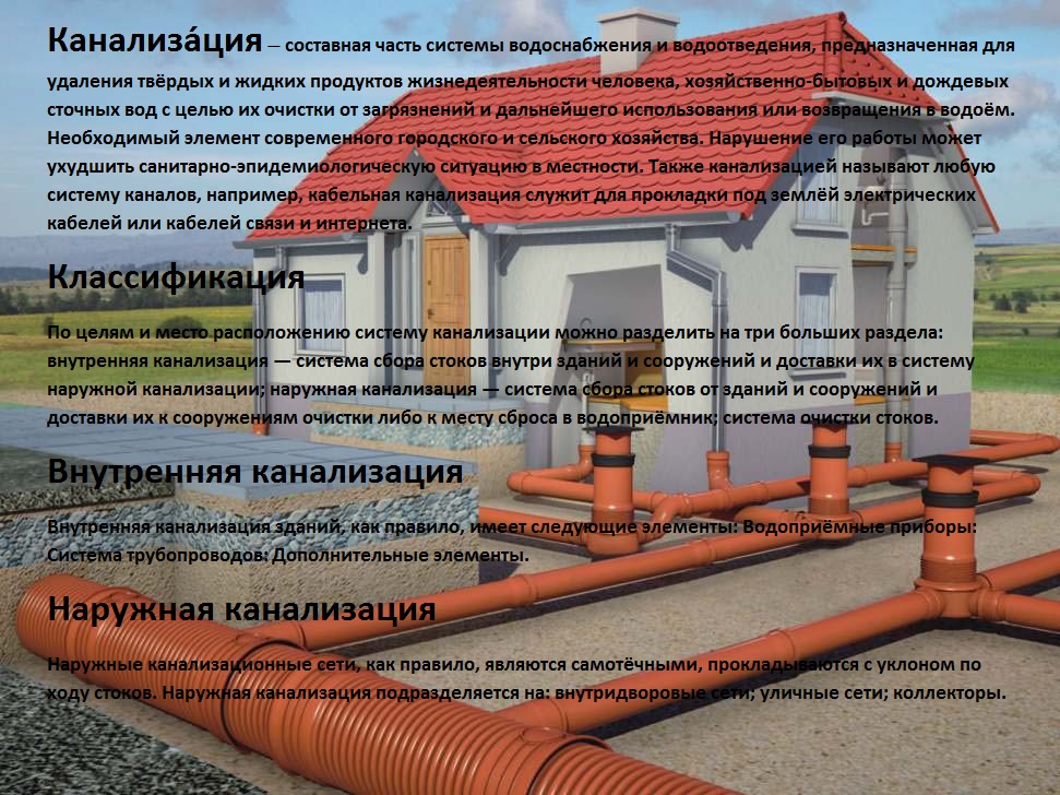 L'assainissement est tout un réseau de canalisations qui a été construit par des ingénieurs pour l'élimination et le traitement des déchets sales. Au stade de la conception, les standards et les normes du SNiP sont pris en compte, en fonction de la structure géologique de la zone et des réglementations pour la pose des canalisations.