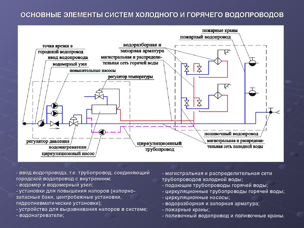 La tête à l'entrée d'une maison à un étage doit être d'au moins 10 mètres. Pour chaque étage suivant du bâtiment, vous devez augmenter l'indicateur de 4 mètres. La plage de température du réseau d'eau chaude sanitaire doit être comprise entre 60 et 75 degrés, quel que soit le type de système d'alimentation en eau.