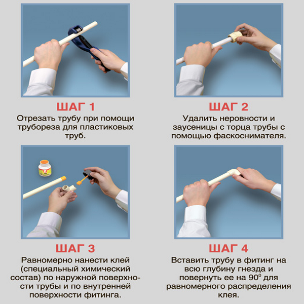 - Le tuyau est connecté au raccord à l'angle requis et fixé dans cette position immobile pendant 1 minute. La colle retient très rapidement les éléments connectés de l'alimentation en eau et ne nécessite pas d'efforts supplémentaires pour les fixer pendant le processus de collage.