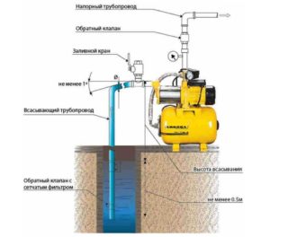 - Système d'aspiration directe. Dans le tuyau d'admission, l'unité d'eau crée un vide, à la suite duquel la pression atmosphérique pousse l'eau dans le tuyau. Des difficultés de travail surviennent en raison de la pression atmosphérique limitée. De telles stations de pompage conviennent à un puits de 15 mètres et pas plus.