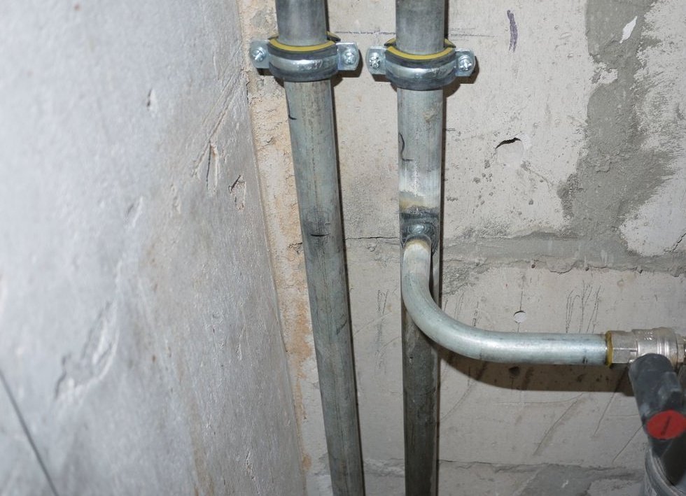 Il est impossible d'ancrer la tuyauterie dans les plafonds. L'installation doit commencer à partir du sous-sol. A la jonction de la contremarche en plastique avec la chaise longue, un té est monté. Dans les conduites d'eau en acier, le tuyau de dérivation de la chaise longue est coupé par soudage au gaz ou électrique. La connexion s'effectue avec les mêmes technologies.