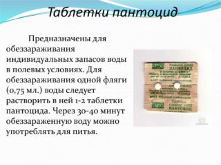 - Pantocide. Son principe actif principal est la galazone. Lorsqu'il agit dans l'eau, le médicament ne donne pas de goût, de couleur, d'odeur tangible. Vous pouvez utiliser des comprimés pour traiter les plaies. Le coût moyen des fonds est de 150 roubles. Le médicament est vendu en blisters / packs de 40 pièces en un.