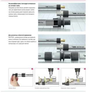 - L'installation de la communication, l'assemblage d'éléments individuels est effectué uniquement à l'aide de raccords et d'outils spéciaux adaptés au polyéthylène réticulé. L'auto-activité dans cette situation ne mènera pas au bien.