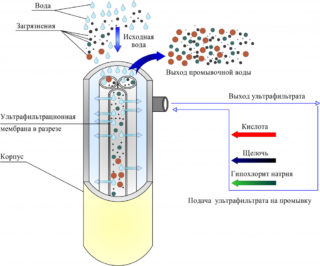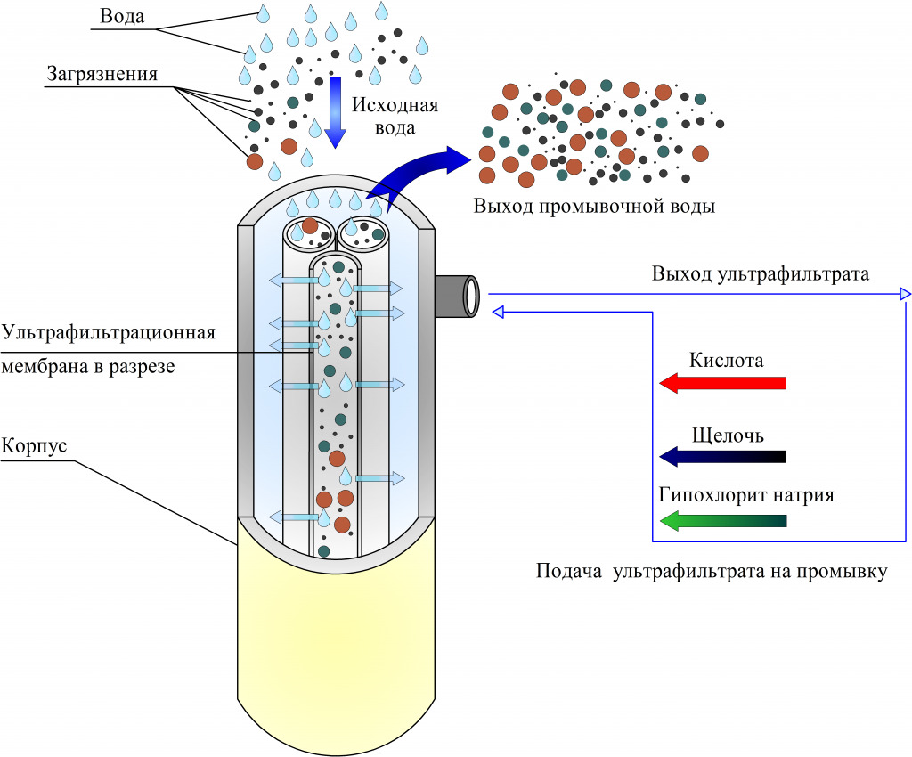 Le schéma général du système, qui comprend l'ultrafiltre, contient un filtre mécanique grossier qui retient le sable, le limon, les sédiments de fond et la matière organique grossière. Ensuite, le liquide sous pression à travers le tuyau d'admission va directement au filtre UV, le processus de nettoyage principal commence. L'eau s'infiltre à travers la membrane poreuse et pénètre dans la sortie. Il existe des systèmes dans lesquels un flux inverse de perméat (filtrat ou eau pure) est possible afin d'éliminer les couches de matière organique accumulées de la membrane. Ce processus est configuré et fonctionne automatiquement. Selon le degré de contamination du liquide source, le rinçage se fait plus ou moins souvent.