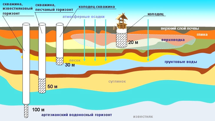 - Verkhovodka - la couche est peu profonde (1-2,5 m), rapidement remplie après les précipitations et la fonte des neiges. Son principal inconvénient est la pollution. Dans la plupart des régions, la verkhovodka est utilisée uniquement pour les besoins des ménages.