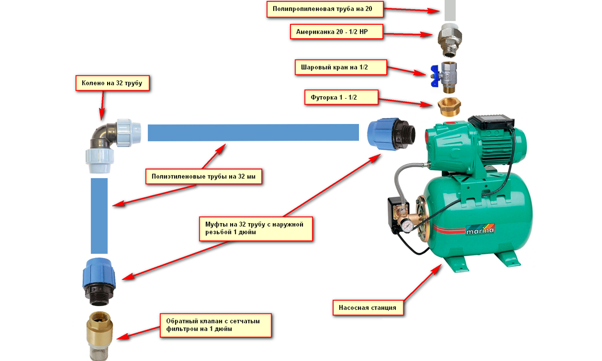 Le montage et le raccordement à faire soi-même d'une station de pompage à un puits et à un système d'alimentation en eau s'effectuent dans l'ordre suivant: