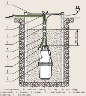 - Un cordon de sécurité est attaché aux yeux de la pompe. Ainsi, trois composants doivent sortir de l'unité - un câble, un tuyau d'alimentation en eau, un câble électrique. Pour éviter qu'ils ne s'affaissent dans le puits, il est préférable de serrer les trois éléments avec des pinces ou du ruban adhésif. Il faut éviter les fortes tensions pour chacun d'eux. Le pas des pinces est de 50 à 70 cm, il est préférable de réaliser le premier raccordement à 20 cm du manchon de la pompe.