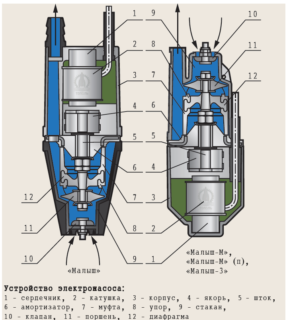 - Lorsque la pompe est allumée, un courant électrique est fourni à l'enroulement. Il crée un champ magnétique qui attire le dispositif vibrant vers lui-même.