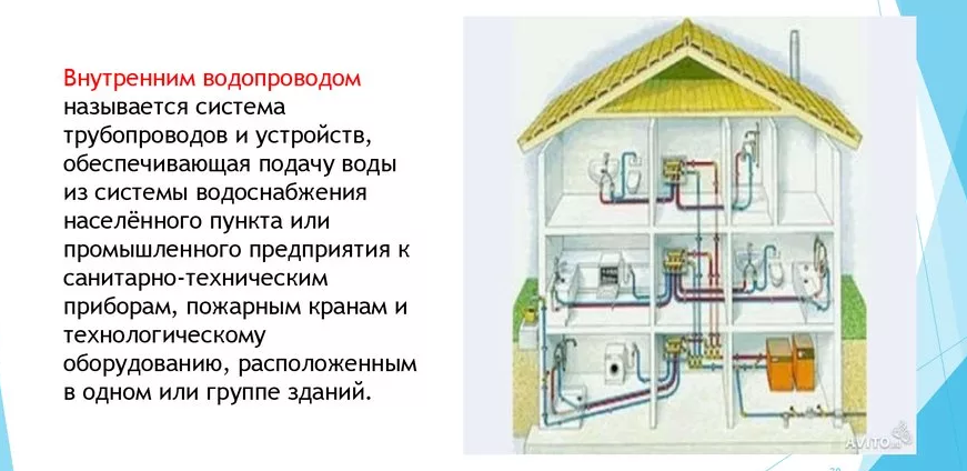 Le système d'approvisionnement en eau interne fournit de l'eau pour la plomberie domestique, les équipements technologiques et de lutte contre l'incendie. Il est alimenté par l'alimentation en eau centrale de la colonie, ou par un puits séparé ou une source naturelle. Le type d'approvisionnement en eau interne est influencé par les capacités techniques, les exigences sanitaires et hygiéniques et de sécurité incendie, ainsi que par la faisabilité économique du projet.