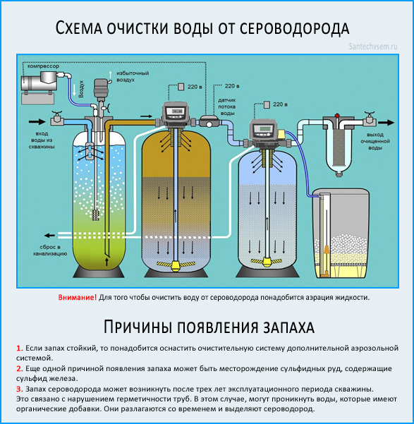 Pour éliminer le problème, vous devez nettoyer le fond du puits source, le pomper, le rincer avec une pompe puissante et remplacer le remplissage du fond. Ici, vous devrez installer un aérateur, qui enrichira le liquide en oxygène. Lorsqu'il interagit avec les molécules du gaz fétide, ces derniers sont oxydés et volatilisés dans l'air. Si cela n'est pas fait, cette eau peut entraîner un œdème pulmonaire, une paralysie et un empoisonnement toxique grave.