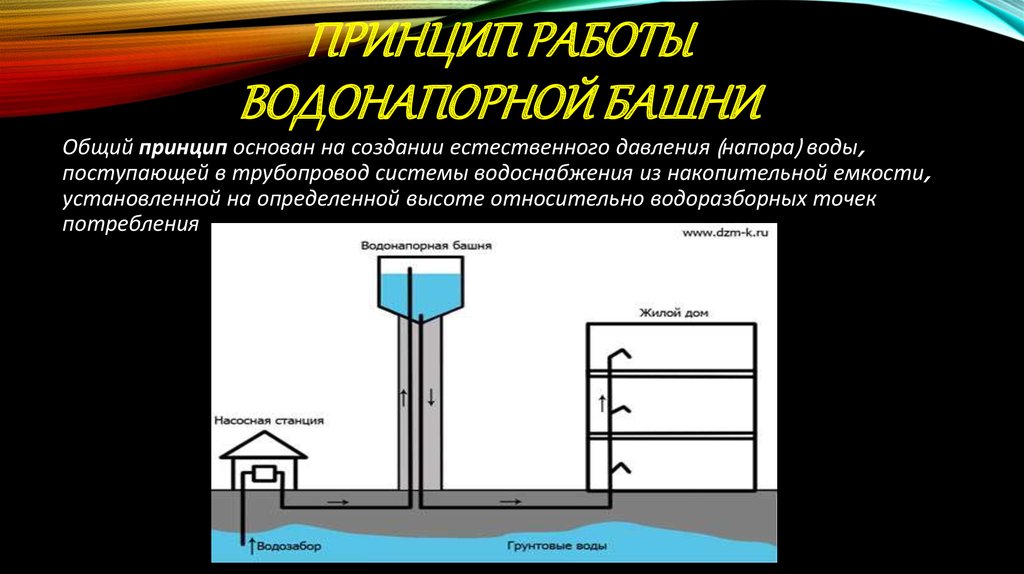 - En cas d'accident à la tour, l'eau s'écoule indépendamment dans la canalisation jusqu'aux consommateurs jusqu'à ce que le réservoir soit complètement vide, tandis que la pression a une faible intensité.