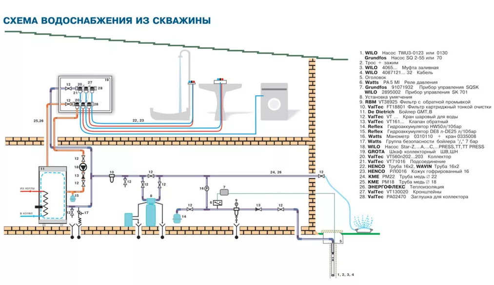Le schéma le plus simple consiste à canaliser un tuyau dans lequel une pompe submersible est située dans un puits, amenant le liquide à la surface et le répartissant vers des points - un potager, un jardin, une maison. L'essentiel des travaux se fera en interne pour poser les canalisations de chaque appareil qui utilise de l'eau.