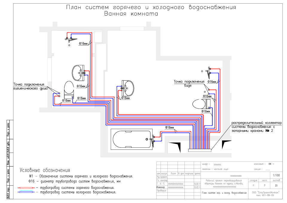 Chaque projet est unique car il est développé spécifiquement pour une habitation afin d'assurer un approvisionnement en eau ininterrompu. Tout d'abord, le client doit décider de l'aménagement approximatif de la cuisine, de la salle de bain, des toilettes et des autres locaux avec accès à l'approvisionnement en eau et à l'assainissement. Ensuite, un schéma du système d'alimentation en eau est sélectionné, en raison des charges opérationnelles futures et du type de montage: à l'extérieur ou à l'intérieur des murs. L'installation cachée dans les murs porteurs n'est pas effectuée.