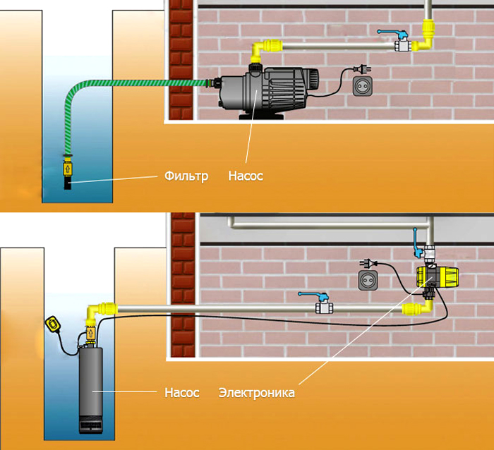 - Avec l'utilisation d'un équipement de pompage submersible avec un interrupteur à flotteur. L'unité fonctionne en milieu aquatique, à une profondeur de 9 mètres ou plus. Ce type d'alimentation en eau convient aux puits de source très longs.