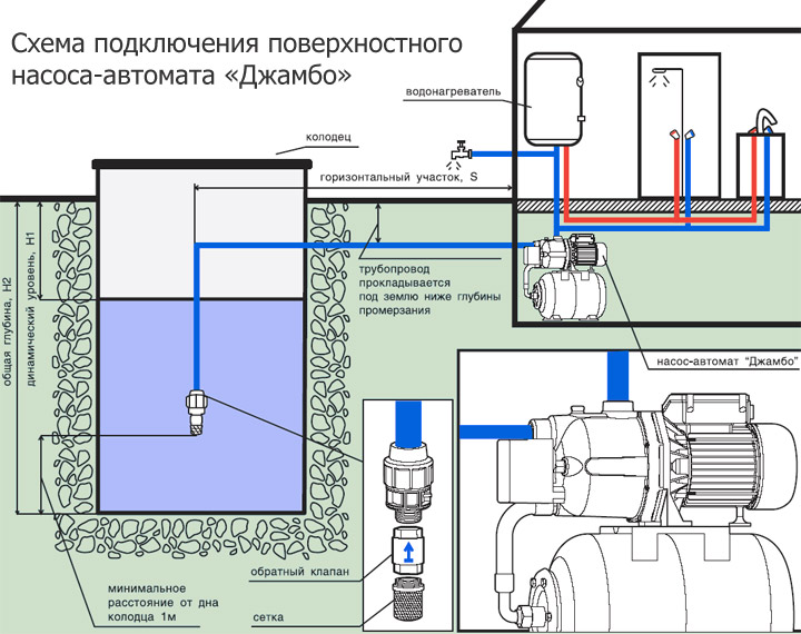 - Utilisation d'une unité de surface. La pompe est installée à proximité immédiate du puits et son tuyau d'admission est abaissé sous le niveau du miroir d'eau. Les appareils de surface sont capables de pomper du liquide d'un niveau allant jusqu'à 8-9 mètres. Lorsqu'il est renforcé par un éjecteur à distance, cet indicateur peut être porté à 12-15 m.