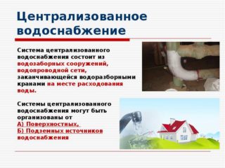 Le raccordement à l'alimentation en eau provient toujours d'un réseau centralisé. Dans les chalets privés et les chalets d'été, l'eau peut provenir à la fois du réseau d'aqueduc central et d'une source locale - un puits ou un puits.