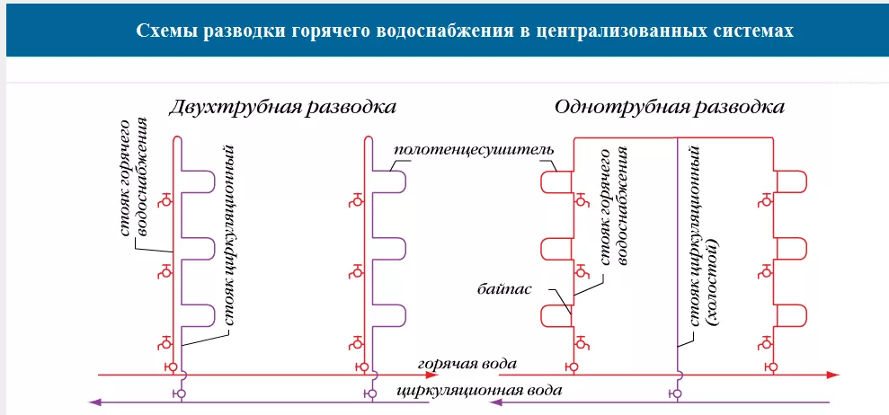 La version à circulation de l'alimentation en eau chaude est plus rentable, mais dans certaines maisons, des systèmes d'alimentation en eau chaude sans issue sont encore utilisés, où l'eau passe d'une source de chauffage à travers des tuyaux sans réchauffer. Ce sont généralement des cottages de quelques étages ou des ateliers industriels. Le câblage en cul-de-sac est plus facile à installer, mais il ne permet pas toujours d'assurer le respect des normes de température de l'eau et de microclimat dans les sanitaires.