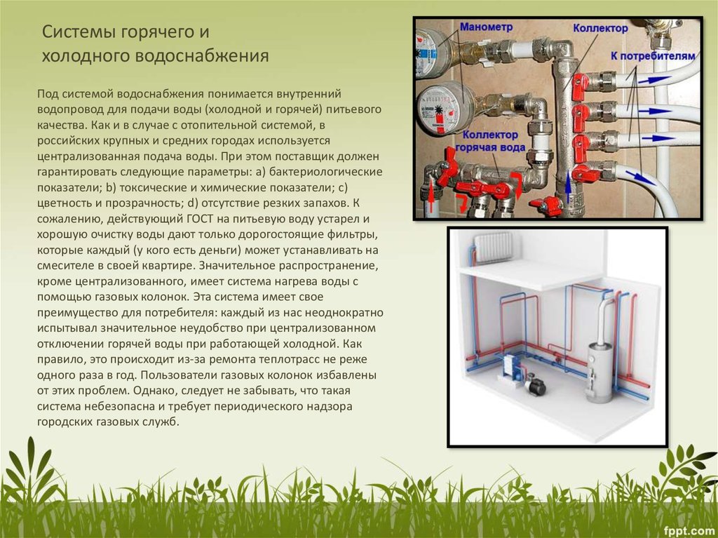 La principale caractéristique de l'approvisionnement en eau des immeubles de grande hauteur est que le liquide doit passer par plusieurs étapes préliminaires de purification des impuretés et de désinfection, par exemple par chloration. Dans les maisons privées alimentées par une source locale, de telles manipulations ne sont généralement pas effectuées. Seuls les filtres locaux sont utilisés.