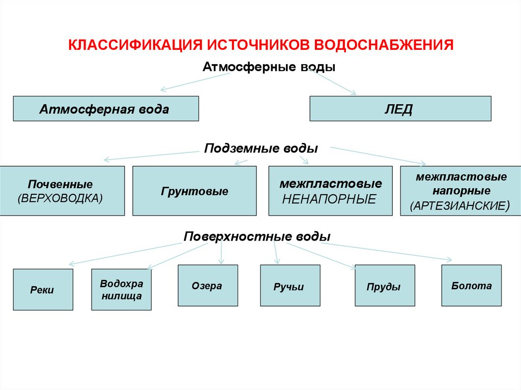 Selon la renouvelabilité des sources, les réseaux d'adduction d'eau sont divisés en circulants et à usage unique. La classification de l'approvisionnement en eau implique également une division en systèmes d'approvisionnement en eau froide et en systèmes d'approvisionnement en eau chaude.