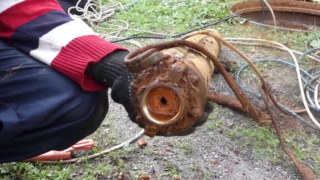 - Soulevez l'ancienne pompe avec précaution tout en tenant le câble, le câble et le tuyau en même temps. Il est important qu'aucun des éléments ne s'affaisse ou ne tombe dans le boîtier. Cela peut conduire à la saisie d'équipements dans la mine. Si la pompe est profonde et abaissée au niveau de 50 m, sa masse totale avec tous les accessoires, l'eau plus la densité du fluide dans le puits de forage sera d'environ 100 kg. Ici, vous devrez même travailler à trois ou à l'aide d'un treuil.