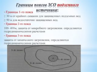 S'il y a plusieurs puits, le plus extrême est pris comme point de référence limite. Pour les sources protégées, où l'aquifère est bordé par deux strates imperméables (par exemple, les eaux artésiennes), en accord avec Rospotrebnadzor, il est permis de modifier la taille de la première ceinture vers le bas s'il existe un avis d'expert sur la probabilité zéro de contamination de la surface.